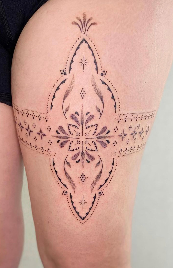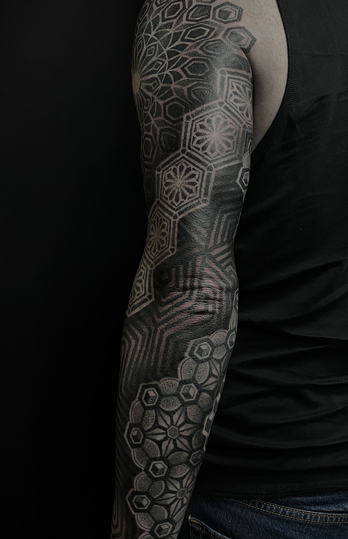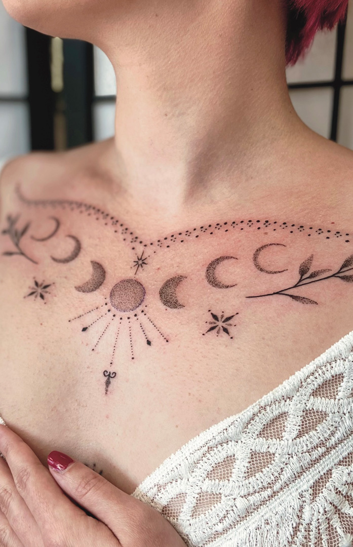 With over 15 years of experience in the art of tattooing, Mon is a versatile artist, who has cultivated a distinctive expertise in geometric patterns, intricate dot work, neotribal designs, and bold blackwork compositions. Her signature aesthetic embraces the mathematical precision of sacred geometry alongside the raw cultural power of neotribal influences, creating a unique visual language that resonates with those seeking meaningful body art.
